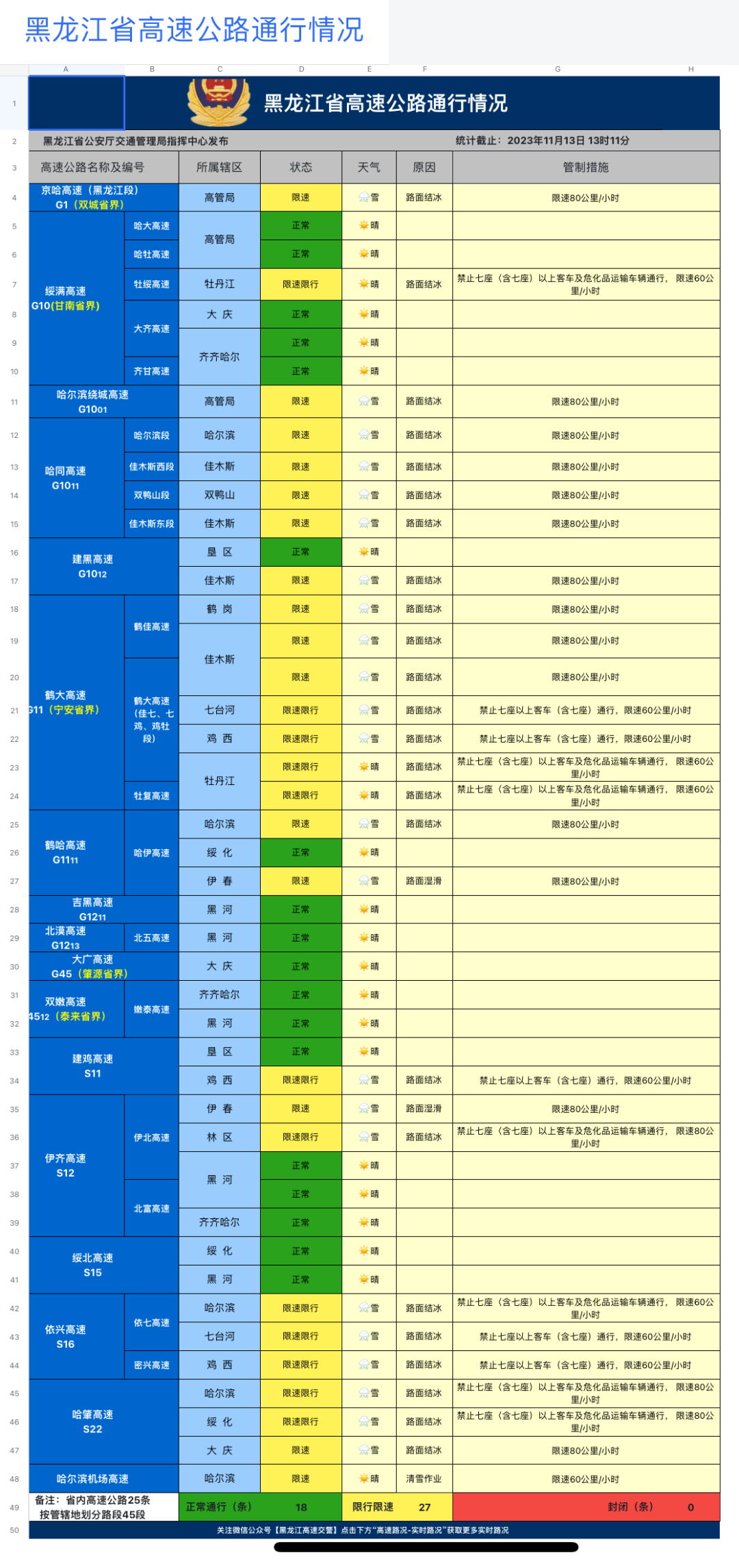 13日13时10分,记者从黑龙江省公安厅高速公路交通管理局获悉,目前省内45段高速公路全部恢复通车。但京哈高速、哈尔滨绕城高速、哈同高速等27条高速仍然限速限行。交警部门提示,驾驶人行车时注意控速。