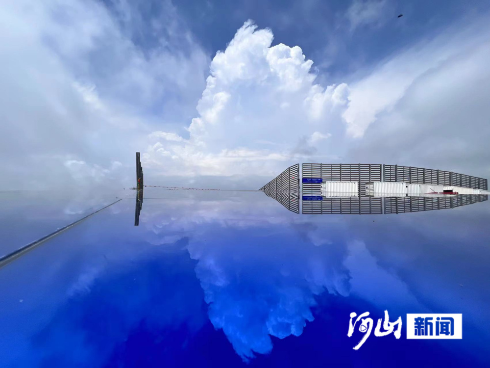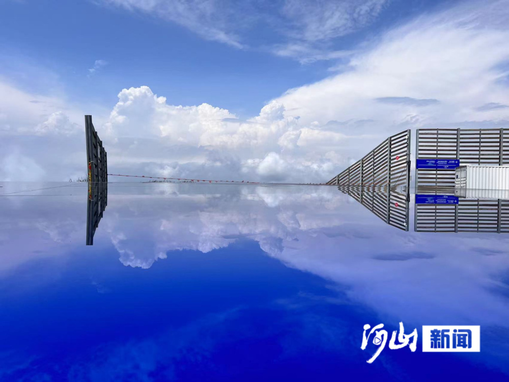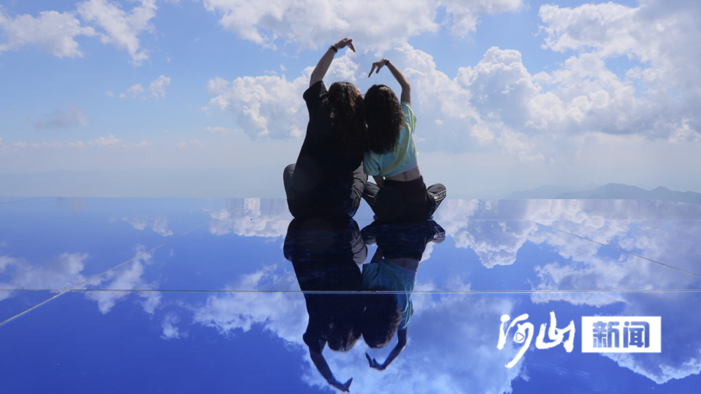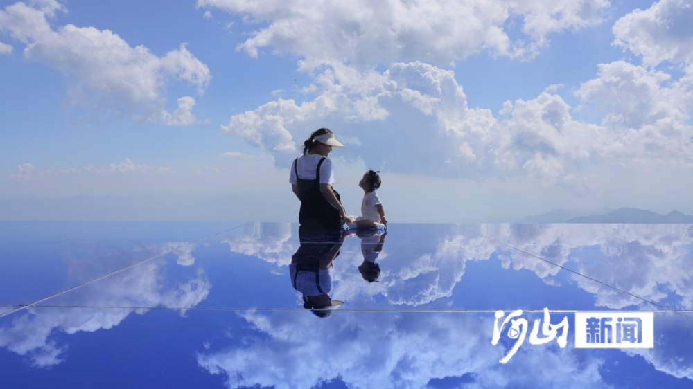 迈步而上,湛蓝的天空、洁白的云朵倒映在巨大的镜面上,踩在脚下的一瞬间给人一种走在云端的错觉,真若置身仙境一般。而一些孩子则惊呼着,似是怕下一秒从这云端掉落下来。