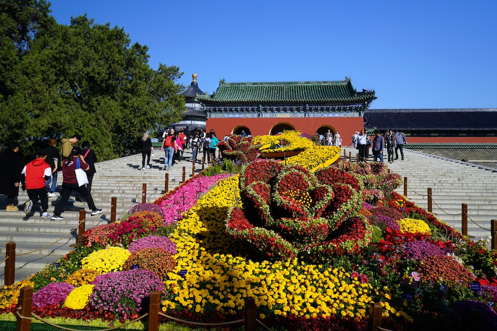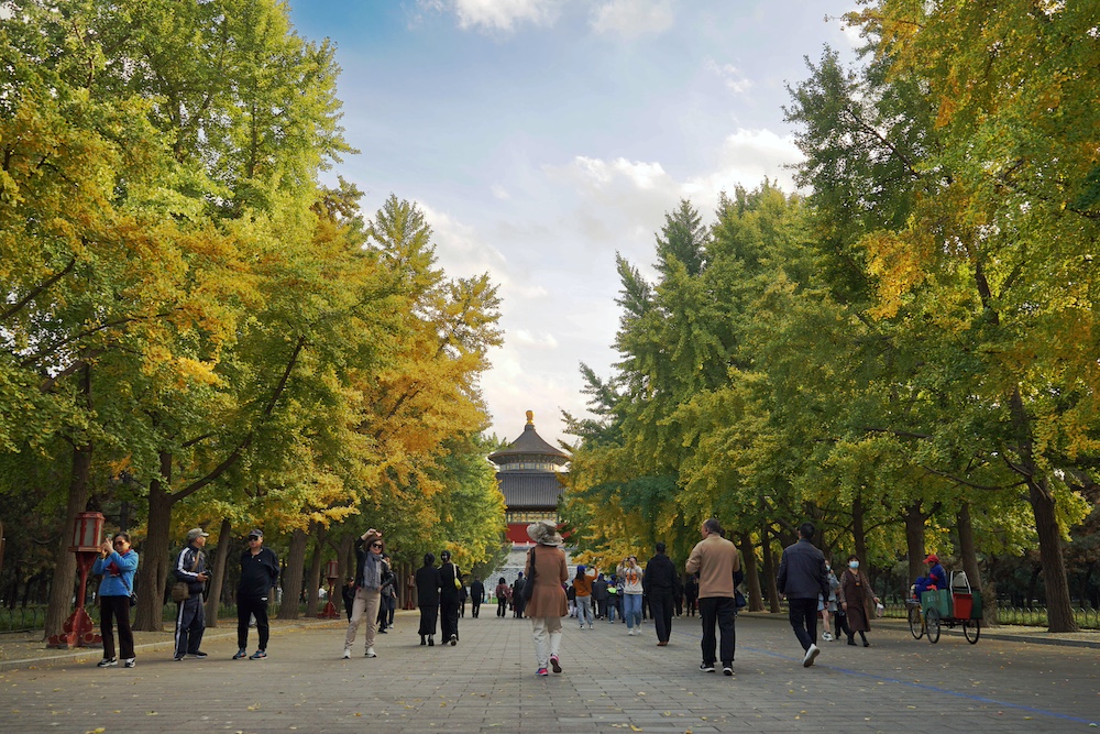 游客在天坛祈年殿外游玩(10月22日摄)。天坛始建于明永乐十八年(1420年),是世界上现存规模最大、保存最完整的古代祭天建筑群,1998年被列入世界文化遗产名录。新华社记者 穆问春 摄