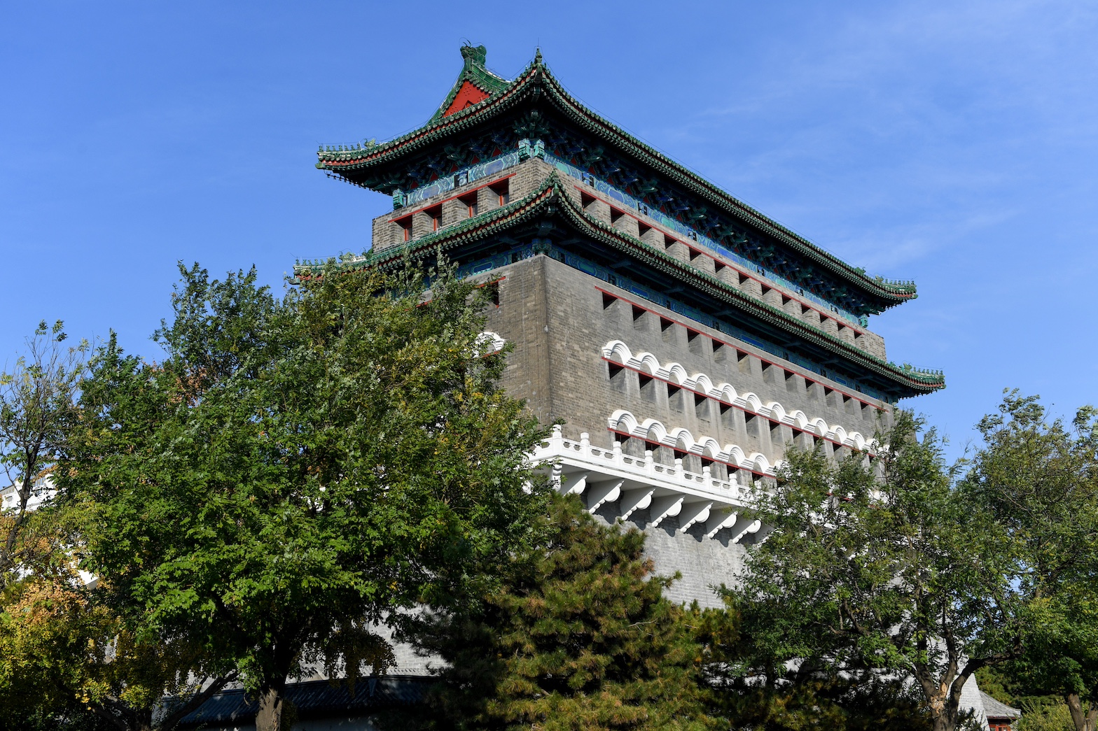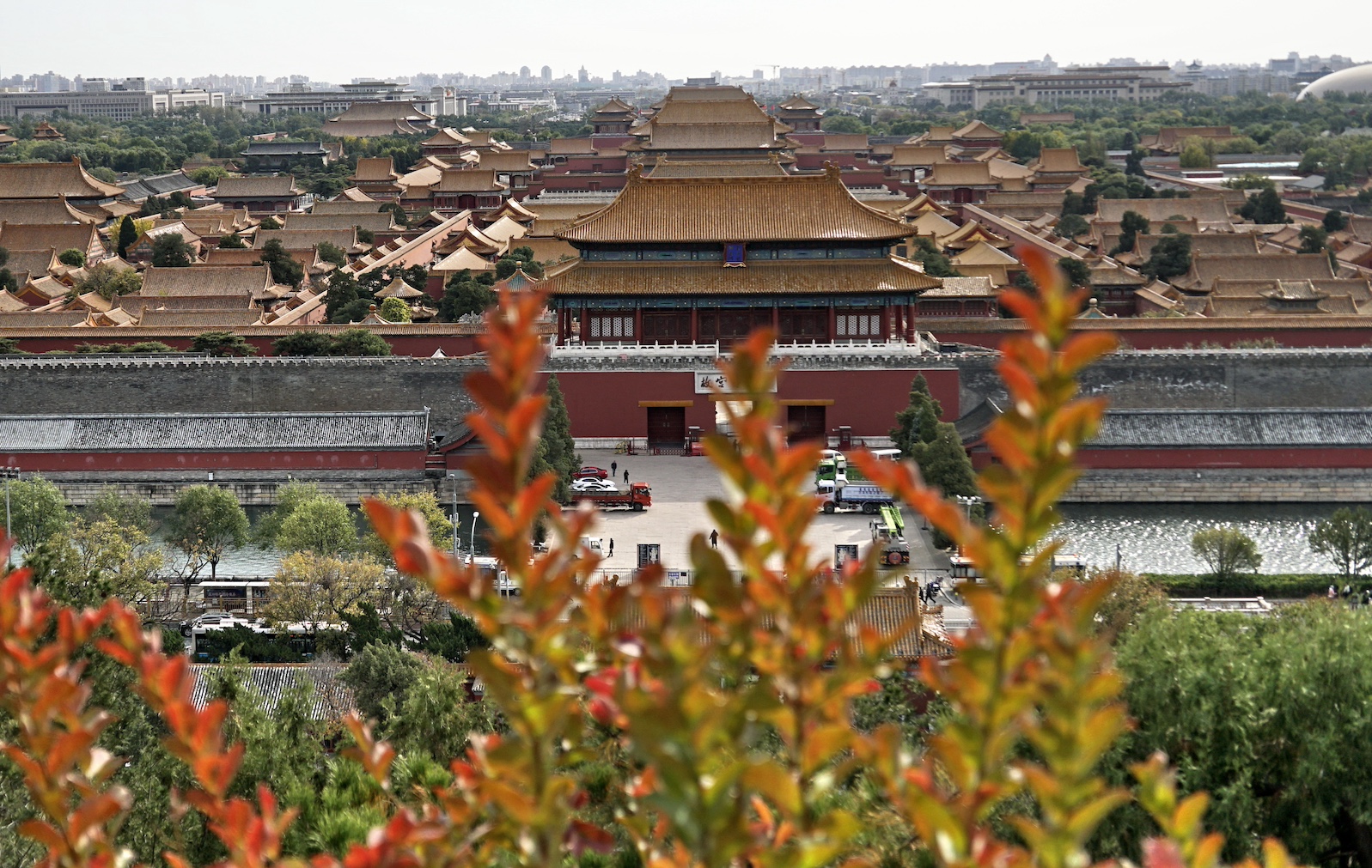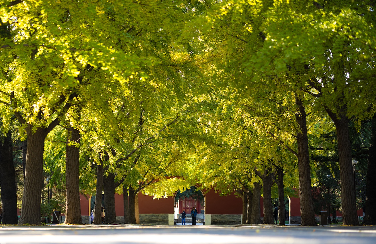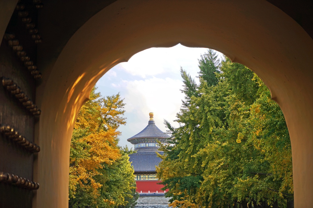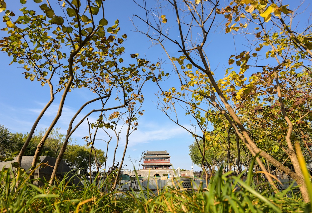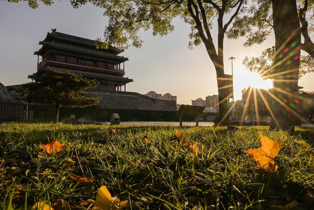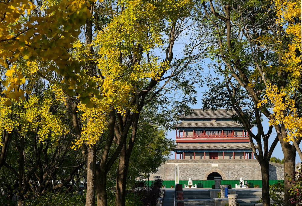 秋日北京,天高云淡。北京中轴线上的古老的文物建筑与色彩斑斓的秋叶相互映衬,美不胜收。