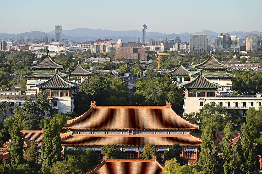 从景山上向北眺望可以看到正在修缮的鼓楼(10月19日摄)。新华社记者 李鑫 摄