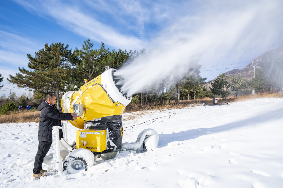 当天上午,造雪工作有条不紊地进行着,雪道旁,依次排列的13台造雪机同时开启,伴随着机器的轰鸣声,阵阵冰露喷射而出,转瞬又化为细碎的人造雪花纷纷扬扬从天而降,不一会儿就把宽阔的雪道装扮得一片银白。
