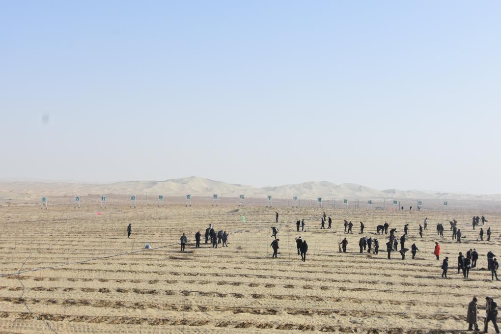 11月13日,位于塔克拉玛干沙漠边缘的和田地区于田县,广大干部群众正在植树造林。新华社记者苟立锋 摄