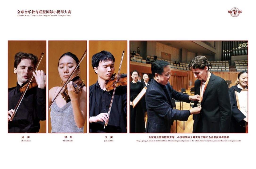 11月13日晚,2023全球音乐教育联盟国际小提琴比赛总决赛音乐会在国家大剧院音乐厅举行,来自中国、美国的三位实力强劲的年轻选手罗超文、崔艾莉(Ellie Choi)和约书亚·布朗(Joshua Brown)陆续上场。音乐会后,经过评委会的慎重评选,全球音乐教育联盟主席、全球音乐教育联盟国际小提琴大赛主席王黎光宣布:美国选手约书亚·布朗获得金奖,美国选手崔艾莉获得银奖,中国选手罗超文收获玉奖。
