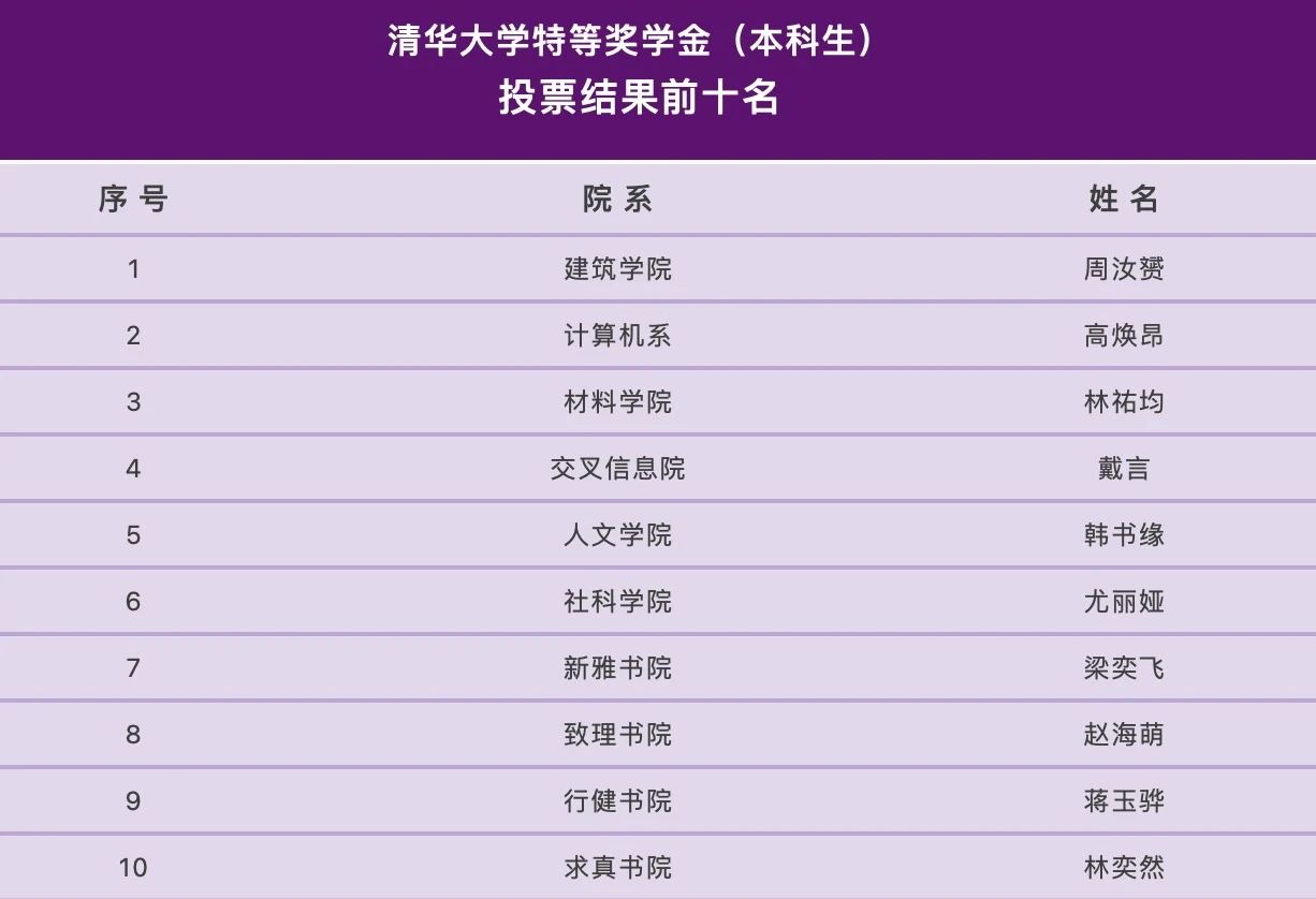 此次答辩产生的投票结果前十名仅作为特等奖学金评选的参考材料提交校务会议,最终获奖名单将由清华校务会议审议确定后在校内信息门户公示。