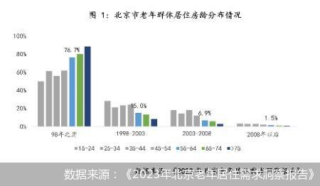 《报告》指出,北京老年居民获取房产时间较早,77%以上老年人居住在1998年地产商品化改革前建成的住宅中,比重明显高于中青年群体,多以福利分房、公房为主,产权类型属于已购公房的比例也明显高于中青年群体。