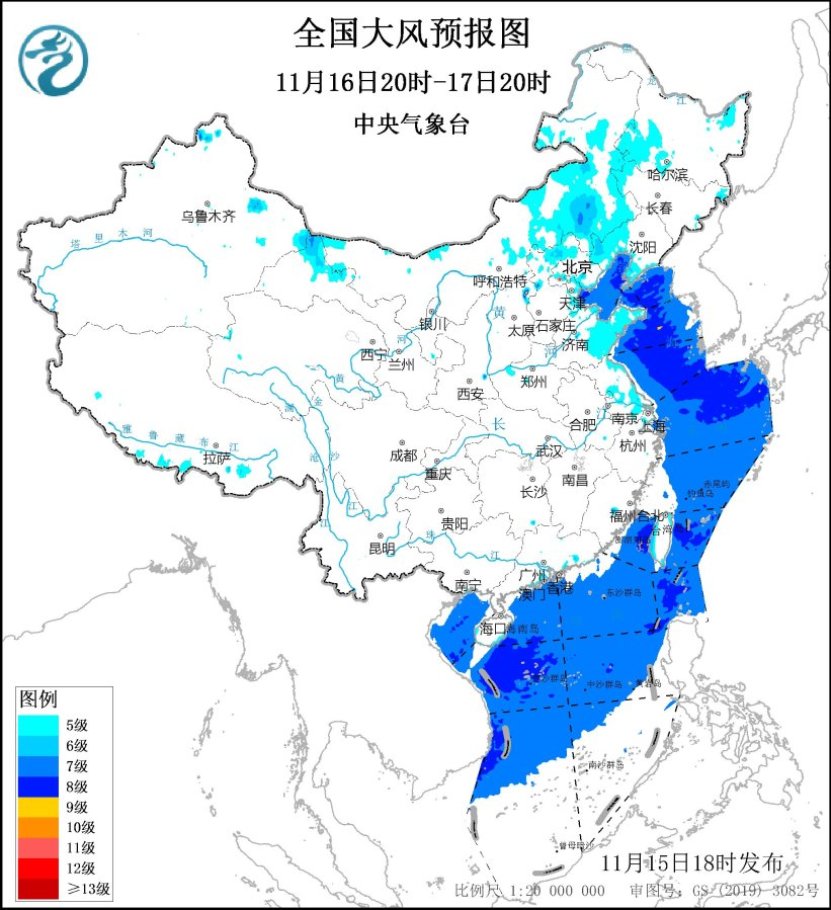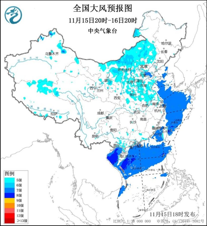 其中,11月15日20时至16日20时,西藏北部、内蒙古中东部、辽宁西部、陕西北部、山西大部、河北大部、北京、天津、山东大部、河南大部、安徽大部、江苏大部、上海大部、广西南部以及广东沿海、海南岛、台湾岛沿海等地有5~6级、阵风7~8级的大风;渤海南部海域、黄海大部海域、东海大部海域、台湾海峡、台湾以东洋面、巴士海峡、北部湾、南海北部和中部海域将有7~8级、阵风9级的大风。11月16日20时至17日20时,内蒙古东部、黑龙江西部、吉林西部、辽宁西部、河北北部、北京、天津、山东中东部、江苏东部以及广东沿海、海南岛、台湾岛沿海等地有5~6级、阵风7~8级的大风;渤海、渤海海峡、黄海大部海域、东海大部海域、台湾海峡、台湾以东洋面、巴士海峡、北部湾、南海大部海域将有7~8级、阵风9~10级的大风。中央气象台11月15日18时继续发布大风蓝色预警(见图1、图2)。