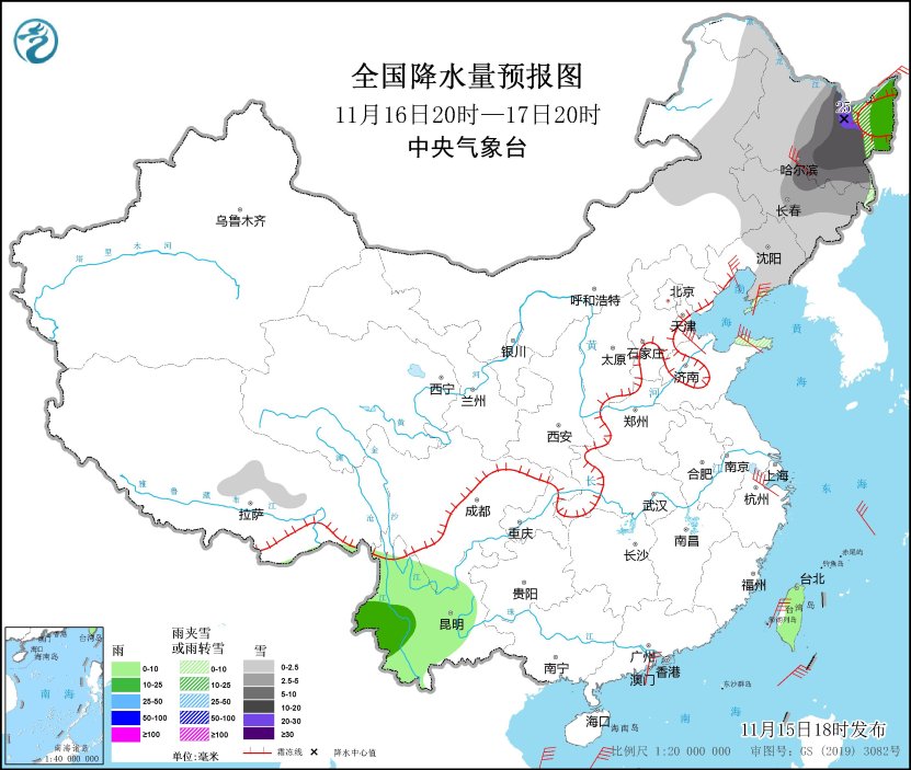 11月16日20时至17日20时,内蒙古东部、黑龙江大部、吉林大部、辽宁中东部等地部分地区有小到中雪或雨夹雪,其中,黑龙江中东部、吉林北部等地部分地区有大到暴雪,局地大暴雪(20~25毫米)。四川南部、云南大部、台湾岛中东部等地部分地区有小到中雨。黑龙江西南部、辽东半岛、山东半岛、浙江北部等地部分地区有5~7级风,近海海域有6~8级大风(见图6)。