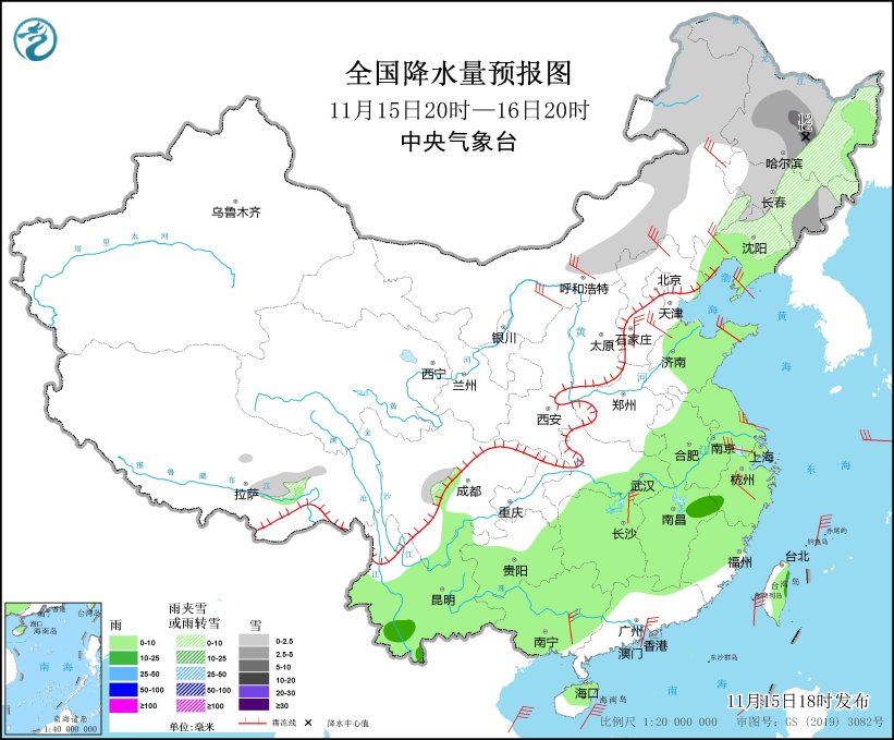 11月15日20时至16日20时,内蒙古中东部、黑龙江大部、吉林大部、辽宁北部等地部分地区有小到中雪或雨夹雪,其中,黑龙江中部、吉林东部等地部分地区有大雪,局地有暴雪(10~12毫米)。辽宁中南部、山东中东部、江淮、江汉东部、江南、西南地区南部和东部、华南西部和北部等地部分地区有小雨,其中,江西北部、浙江西南部、云南西南部、台湾岛东部等地部分地区有中雨。内蒙古中东部、辽宁、河北中北部、山东半岛、江苏南部、湖南北部、浙江中部、广西东南部等地部分地区有4~6级风(见图5)。
