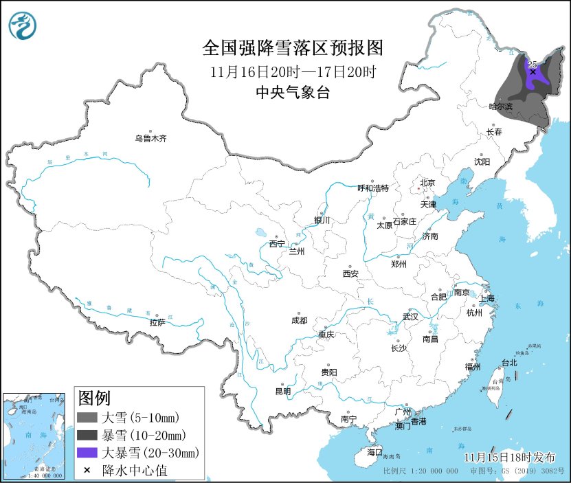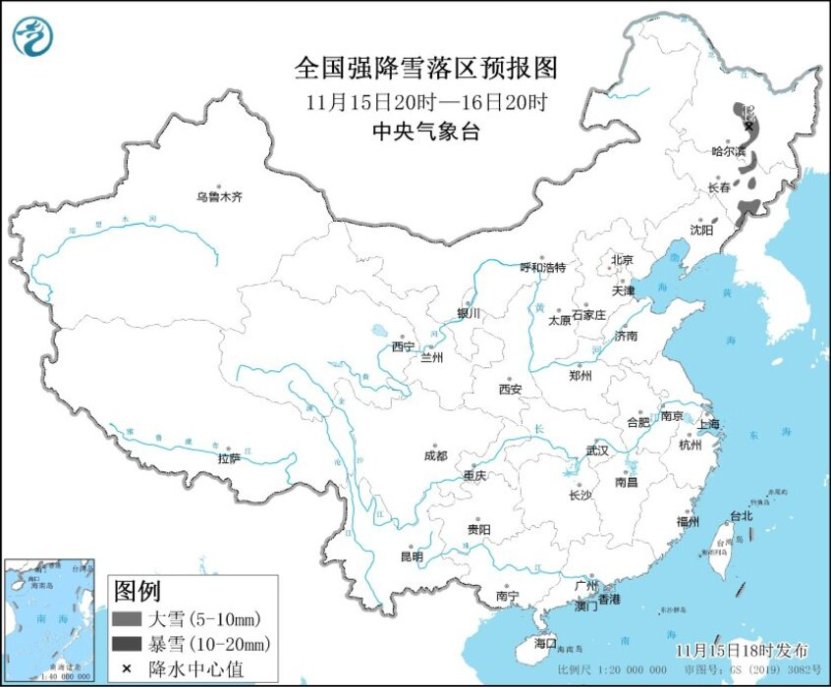 11月15日夜间至17日,内蒙古中东部、东北地区等地将有一次雨雪天气过程。其中,11月15日20时至16日20时,黑龙江中部、吉林东部等地部分地区有大雪,黑龙江中部局地有暴雪(10~12毫米),上述部分地区新增积雪深度3-5厘米,局地可达7厘米以上。11月16日20时至17日20时,黑龙江中东部、吉林东北部等地部分地区有大雪,黑龙江东部部分地区有暴雪,局地大暴雪(20~25毫米),上述部分地区新增积雪深度5~10厘米,局地15厘米。中央气象台11月15日18时发布暴雪黄色预警(见图3、图4)。