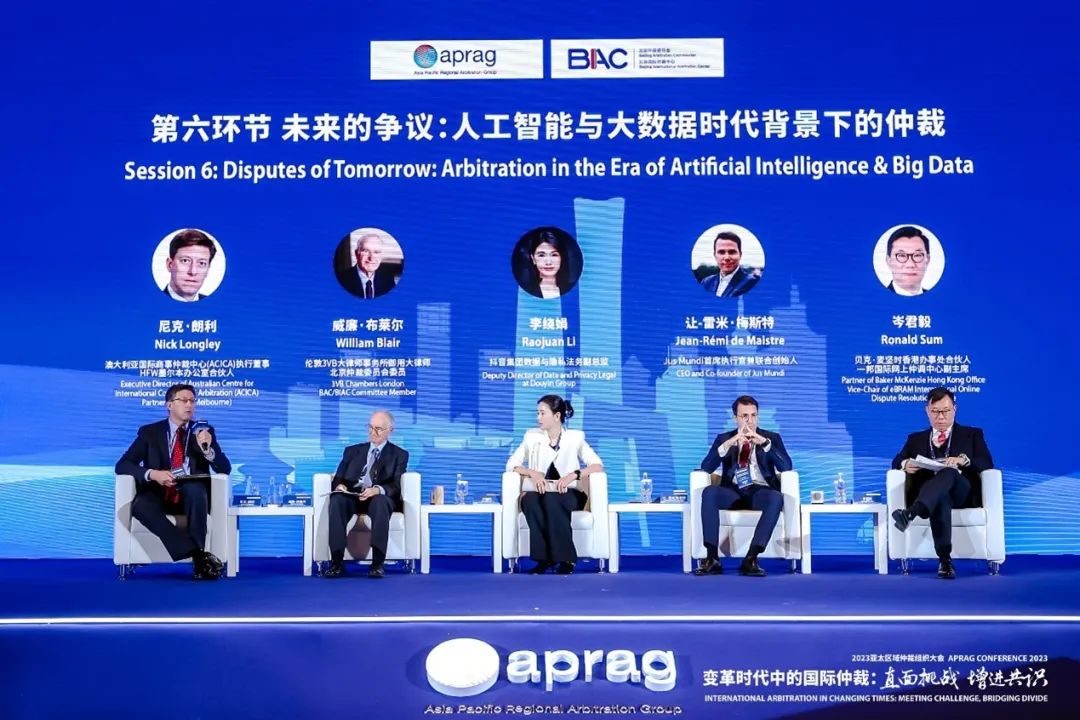 第六环节由澳大利亚国际商事仲裁中心执行董事及HFW墨尔本办公室合伙人Nick Longley主持,北京仲裁委员会委员及伦敦3VB大律师事务所御用大律师William Blair、抖音集团数据与隐私法务副总监李绕娟、Jus Mundi 首席执行官兼联合创始人Jean-Rémi de Maistre、贝克·麦坚时香港办事处合伙人及一邦国际网上仲调中心副主席岑君毅发言。