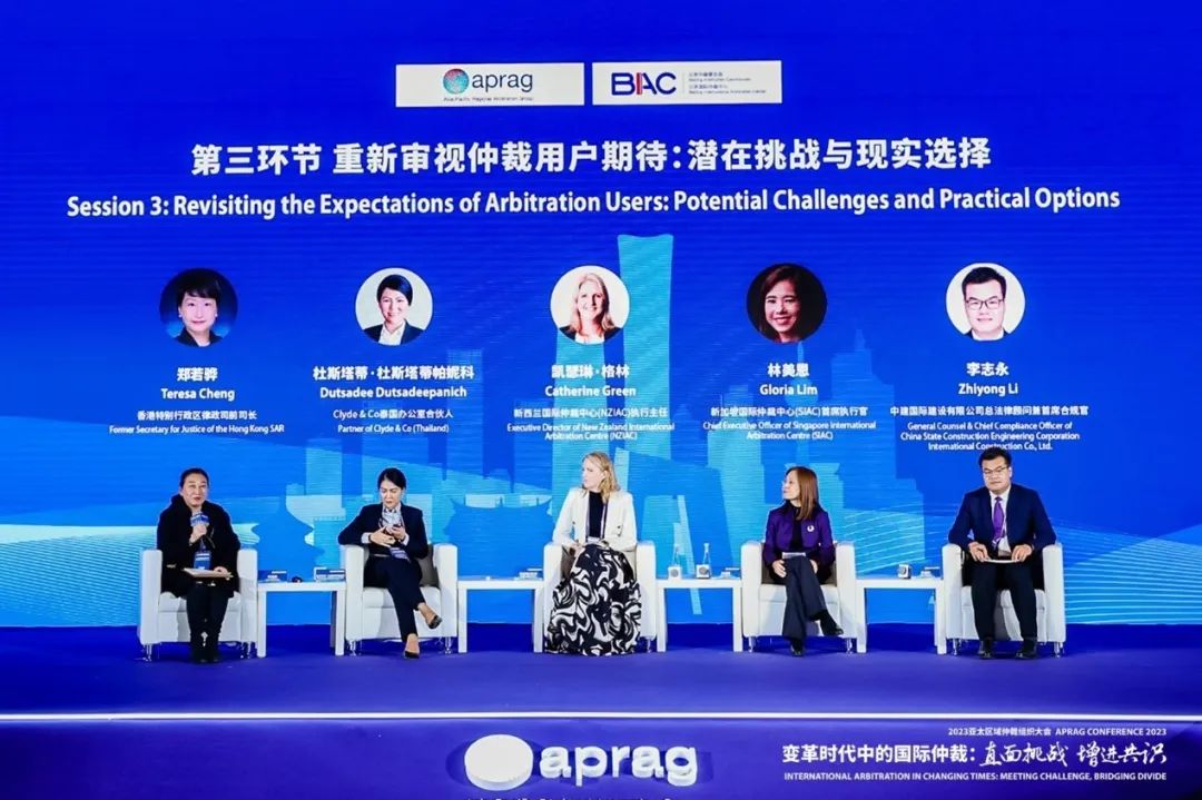 第三环节由香港特别行政区律政司前司长郑若骅主持,Clyde & Co泰国办公室合伙人Dutsadee Dutsadeepanich、新西兰国际仲裁中心执行主任Catherine Green、新加坡国际仲裁中心首席执行官Gloria Lim、中建国际建设有限公司总法律顾问兼首席合规官李志永发言。本环节采用问答形式,深入探讨了仲裁用户的期望与仲裁实践的挑战。