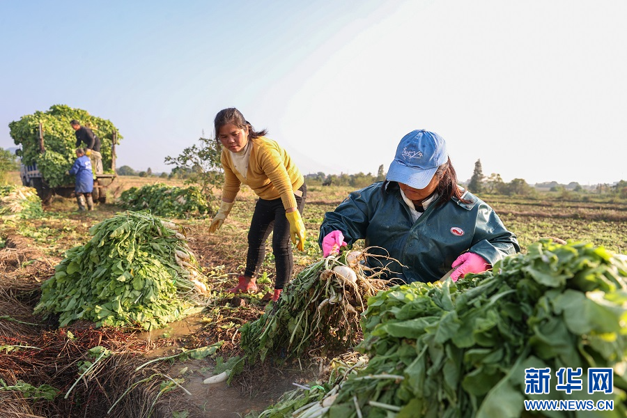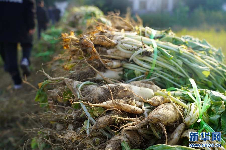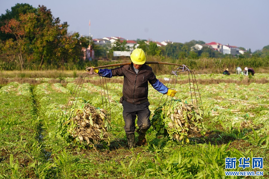 11月14日,在江西省南昌市南昌县柏岗村的田间地头,村民们在清洗、搬运萝卜。新华网发