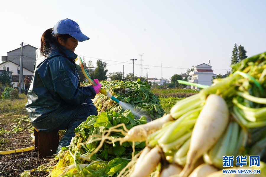 11月14日,在江西省南昌市南昌县柏岗村的田间地头,村民在清洗萝卜。新华网 王凯丰 摄