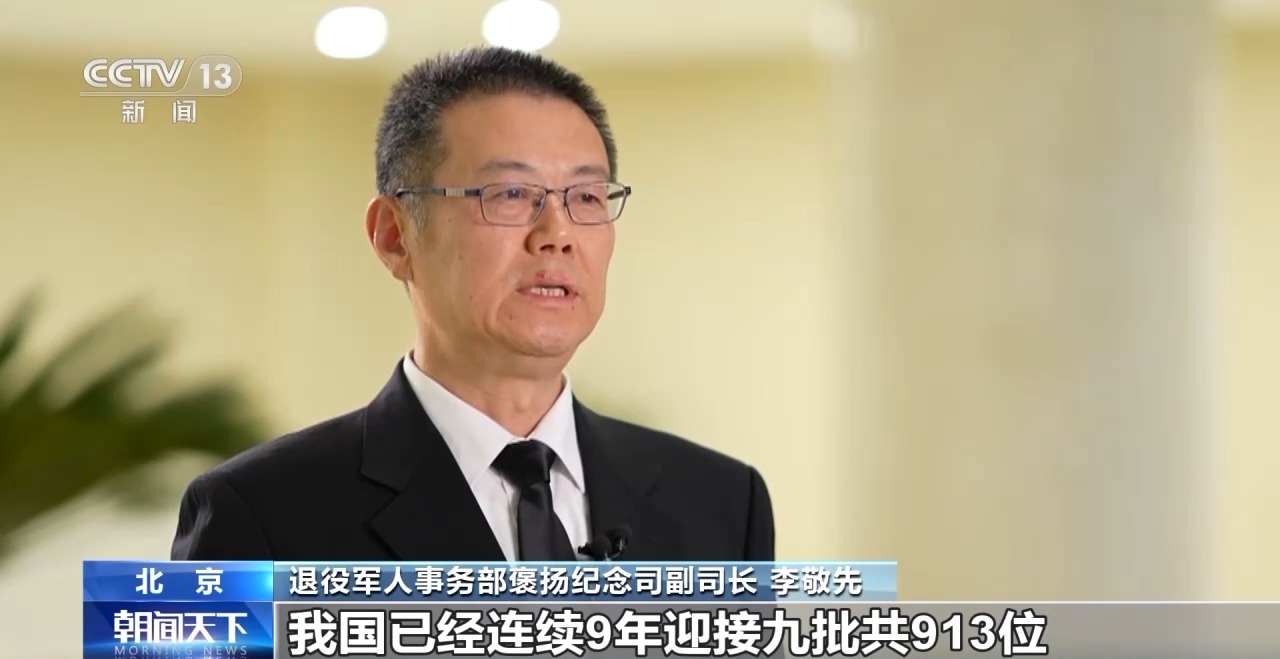 退役军人事务部褒扬纪念司副司长 李敬先:截至2022年,我国已经连续9年迎接九批共913位在韩中国人民志愿军烈士遗骸归国安葬。今年将再次从韩国迎回第十批中国人民志愿军烈士遗骸。