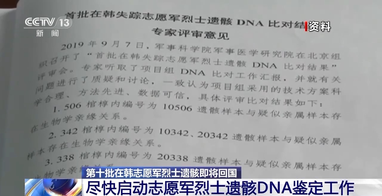 截至目前,迎回的913位烈士遗骸DNA检材提取鉴定比对工作正在持续进行,已经为10位烈士确认身份并找到亲属。后续,通过在韩志愿军烈士遗骸和烈士亲属DNA信息采集及亲缘关系鉴定比对等工作,将让更多的烈士“从无名变有名、从回国到回家”。
