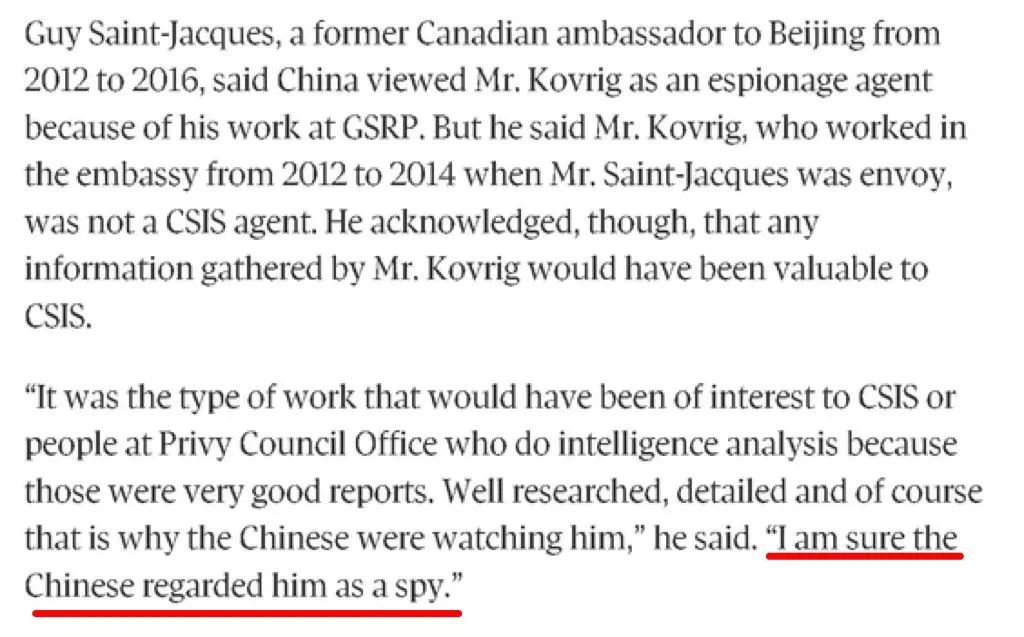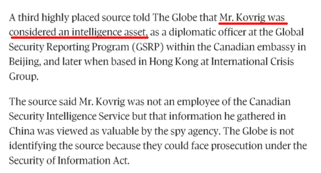 因为一名曾经在加拿大驻华大使馆工作过的前外交官就直言不讳地对《环球邮报》透露,尽管加拿大驻华大使馆那个从事情报工作的部门并不属于加拿大安全情报局这个加拿大的正牌间谍机构,但这个部门搜集的情报对后者而言一直是“很有价值”的。所以——这名前外交官说——也难怪中国方面会将康明凯视作间谍。