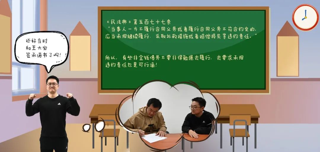 深夜时间再次来临,不怕大家嫌弃我老这么献丑,学点儿知识就想显摆,我还是想和我的读者朋友们分享一点点心得。《民法典》第五百七十七条写道:“当事人一方不履行合同义务或者履行合同义务不符合约定的,应当承担继续履行、采取补救措施或者赔偿损失等违约责任。”像我这次,就是因为跟王大宝通过签订《承诺书》有了补充约定,在王大宝没办法实现的时候,才要求他赔偿损失。