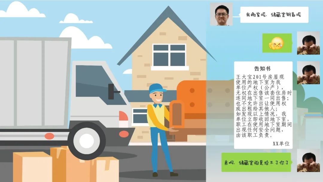 搬着搬着,我突然想起来,不对啊,王大宝还没给我储藏室的钥匙呢。我赶紧联系上他,这哥们立即给我发了个哭泣的表情,随后发来一个《告知书》,里面写道:“王大宝201号房屋现使用的地下室为我单位产权(公产),无权在出售该套住房时连同地下室一同出售;也不允许出让使用权或出租给其他人;如发现以上情况,我单位立即收回地下室。职工在使用地下室期间,出现任何安全问题,由该职工负责。”