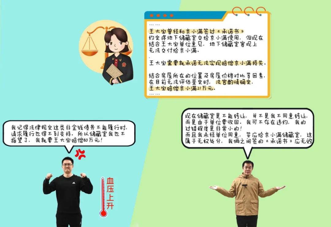 我细细品了判决书,看明白了,这是因为王大宝和我曾经签订过《承诺书》,约定将地下储藏室交给我使用,但现在结合他们单位的意见,地下储藏室客观上没法给我。