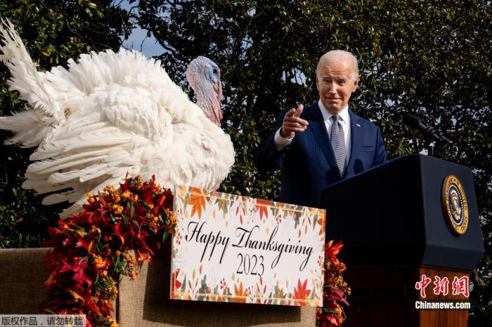 当地时间2023年11月20日,美国总统拜登总统在白宫“赦免”火鸡。