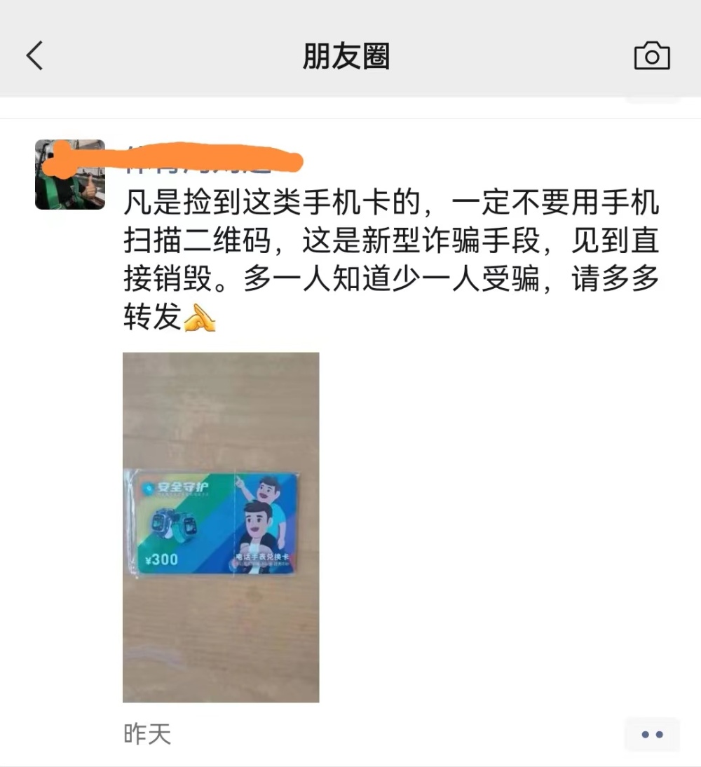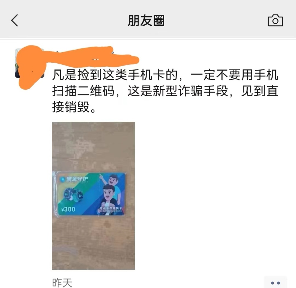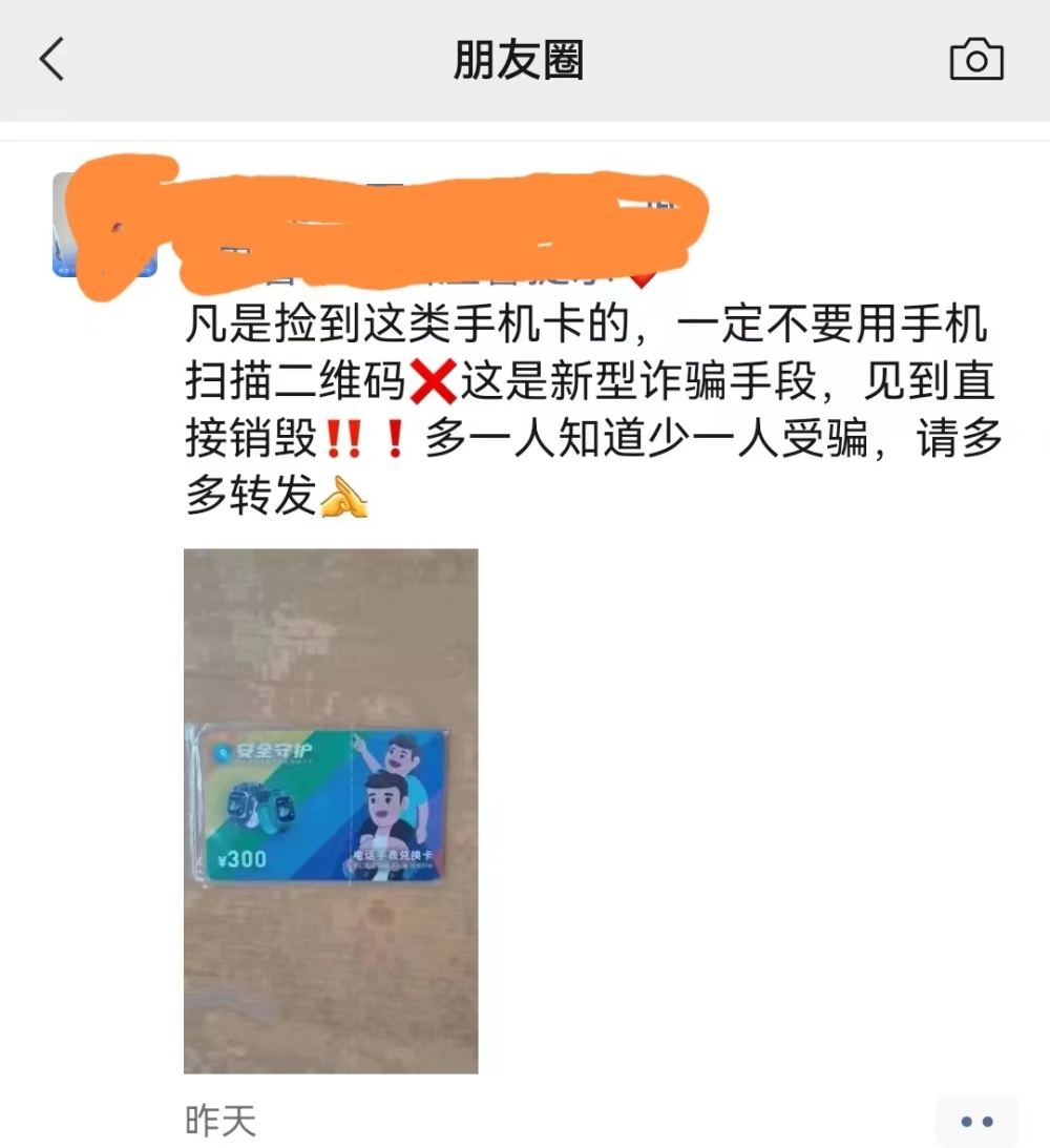 连日来,一则“凡是捡到这类手机卡的,一定不要用手机扫描二维码,这是新型诈骗手段,见到直接销毁。多一人知道少一人受骗,请多多转发”的消息刷爆了微信朋友圈。