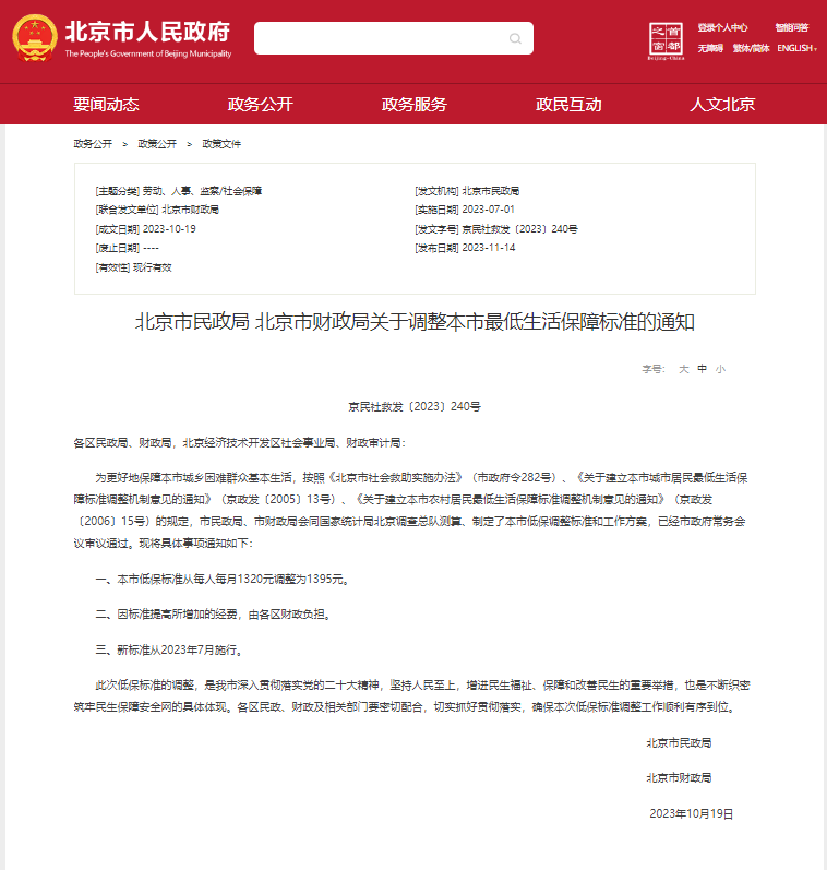 为更好地保障本市城乡困难群众基本生活,按照《北京市社会救助实施办法》(市政府令282号)、《关于建立本市城市居民最低生活保障标准调整机制意见的通知》(京政发〔2005〕13号)、《关于建立本市农村居民最低生活保障标准调整机制意见的通知》(京政发〔2006〕15号)的规定,市民政局、市财政局会同国家统计局北京调查总队测算、制定了本市低保调整标准和工作方案,已经市政府常务会议审议通过。现将具体事项通知如下: