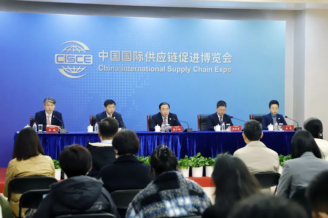 首届中国国际供应链促进博览会筹备情况新闻发布会现场。