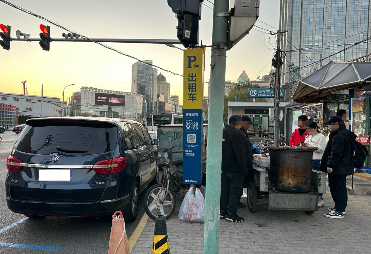 鸠占鹊巢的画面,也出现在东大桥。地铁6号线东大桥站B口附近有一处扬招站,距离朝阳医院四五百米,附近还有公交场站和居民小区。扬招站标牌南侧路边设置的出租车停车位,被私家车辆占领。而标牌北侧则有一个烤红薯游摊,时不时就有客人在周边围成一团。一位家住附近的老人说,自己从来没在这个扬招站打过车,有需求时就靠儿女提前网上叫车。