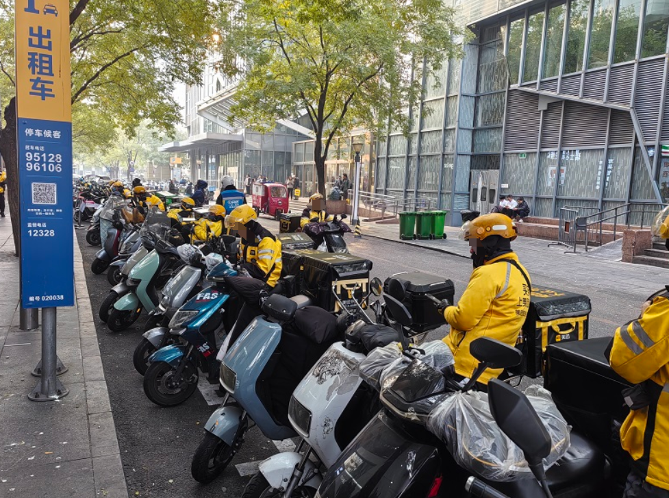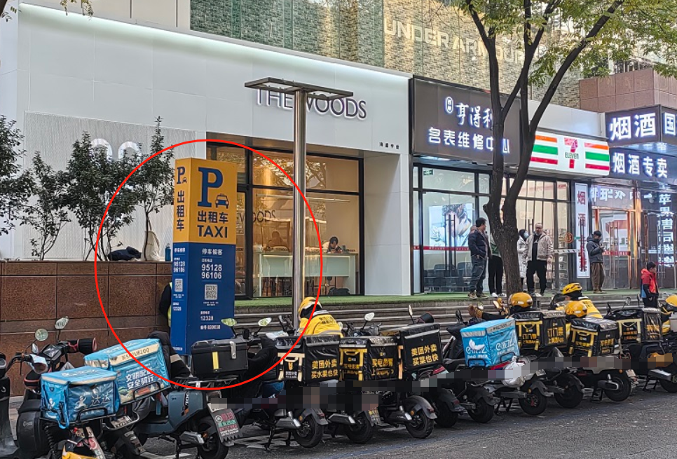 午后,西单大悦城区域人车繁忙。君太百货和西单大悦城之间的皮库胡同中,不少外卖小哥正坐在电动自行车上等单休息。紧挨着一溜儿电动车,就是“出租车 TAXI”的扬招站招牌。这处扬招站共有2个蓝色实线划出的出租车车位,地面也用出租车三个大字标出。然而,车位却完全“淹没”在停放的电动自行车中。