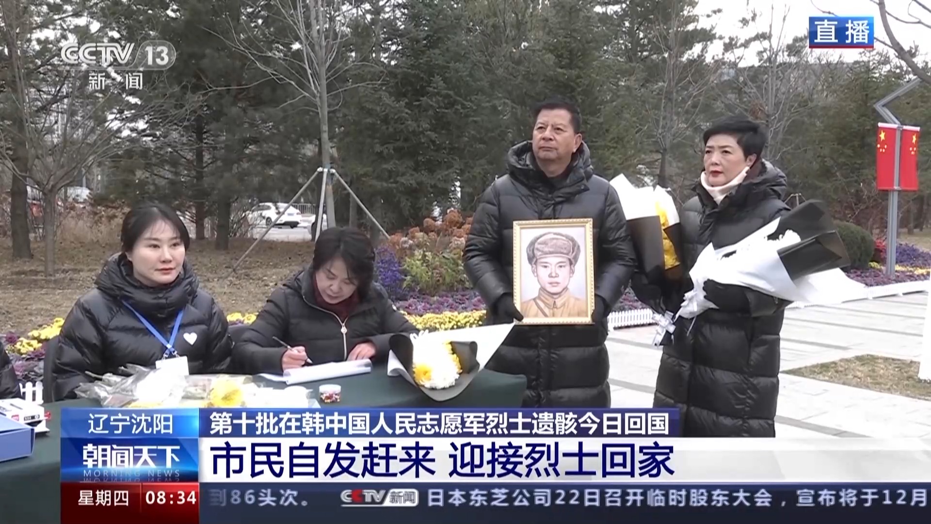 冬日的沈阳城,寒风阵阵,但有一些市民已经陆续赶来。在这些自发赶来迎接英烈的人群中,有一位手捧画像的特别群众,他叫陈德志,今年72岁。他是特意从广州赶到沈阳,来参加迎接英烈的活动。他手中拿的是父亲的画像,他的父亲也是牺牲在朝鲜战场的志愿军烈士,名叫陈道友。陈道友牺牲时,陈德志只有9个月大。从小到大,陈德志只知道父亲是一名志愿军烈士,却从来不知道父亲的下落,也不知道父亲的模样。直到前几年,他终于在沈阳抗美援朝烈士陵园的英名墙上找到了父亲的名字,并且在专家的帮助下,通过亲属照片比对,为父亲画出了一张画像,了却了心中最大的夙愿。今天,陈德志特意带着父亲的画像,一起迎接父亲的战友回家。
