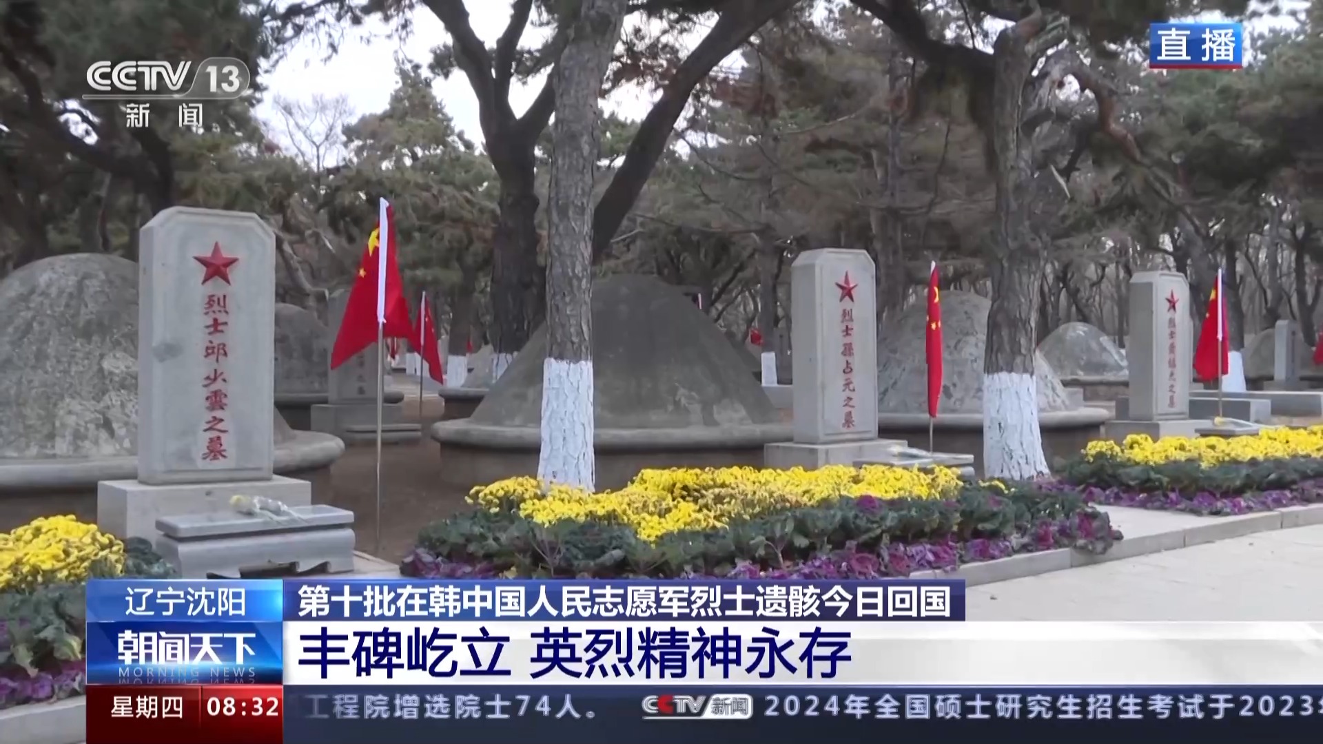 今天,是第十批在韩中国人民志愿军烈士遗骸回家的日子。此时此刻,在苍松翠柏掩映下,沈阳抗美援朝烈士陵园一片庄严、肃穆。为了欢迎英雄回家,陵园的工作人员和社会各界的志愿者们,已经早早地就把这里打扫得干干净净,每一座墓碑,每一个名字,都被擦拭得一尘不染。今天一大早,工作人员又在每一个墓碑前,敬献了一枝鲜花,表达敬意和哀思。