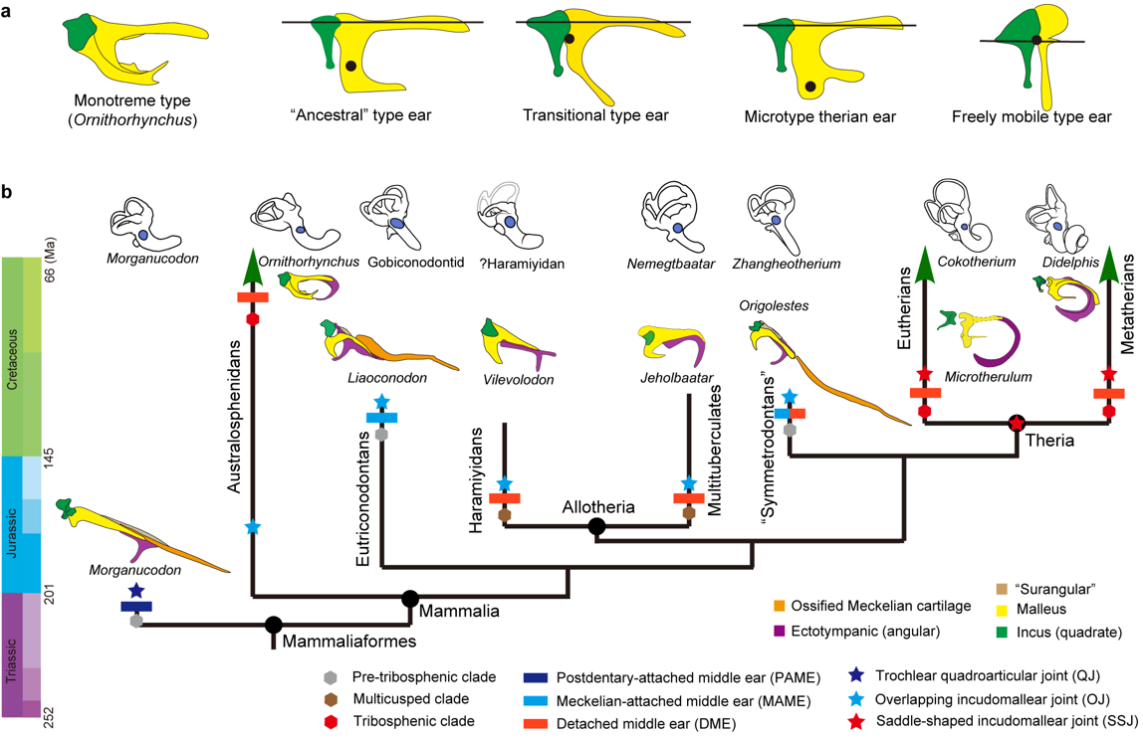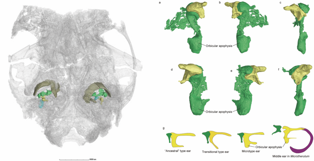 哺乳动物中耳是渐进演化的经典案例。十九世纪欧洲生物学家已经观察到了现生哺乳动物中耳听小骨的多样性。在过去很长时间里,由于化石保存问题,哺乳动物中耳早期演化的讨论一直缺乏直接的化石证据。研究表明哺乳动物中耳听小骨经历了下颌中耳和过渡型中耳两个演化阶段,最终完全脱离下颌进入中耳腔。这一演化事件在中生代哺乳动物不同支系中多次发生。然而,在与我们人类演化密切相关的兽类(包括真兽类和后兽类)祖先中,中耳演化的直接证据十分有限。