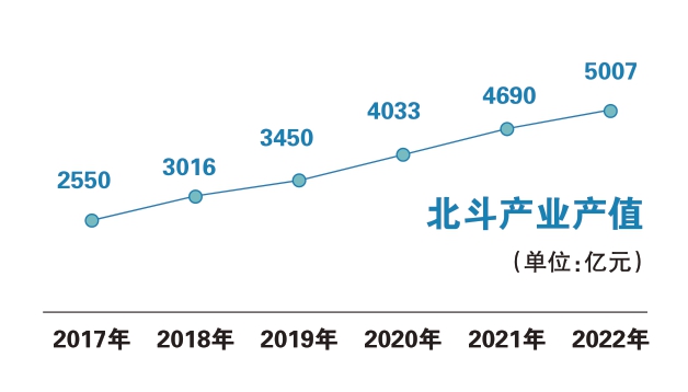根据自然资源部测绘标准化研究所整理的数据,2017-2022年,北斗产业产值逐年递增,分别为2550亿元、3016亿元、3450亿元、4033亿元、4690亿元、5007亿元。据2022年11月发布的《携手构建网络空间命运共同体》白皮书预计,按照目前北斗系统的产值增加速度,2025年产业规模有望达万亿元。