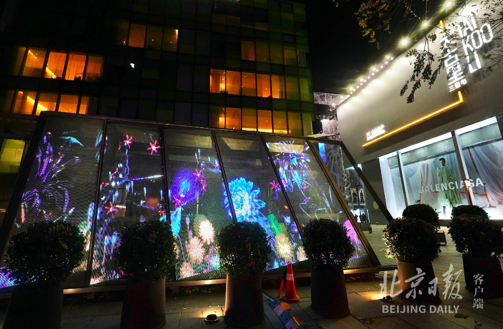 走在三里屯路宽阔的步行区域,仿佛漫步在唯美的银河之间:仰头,多姿多彩的“繁星”悬在国槐树梢,火树银花徐徐绽放;低头,枫叶、桃花摇曳生姿,浪漫至极。火红色的“凤凰”在繁花中展翅飞舞,增添了一抹壮丽之美。
