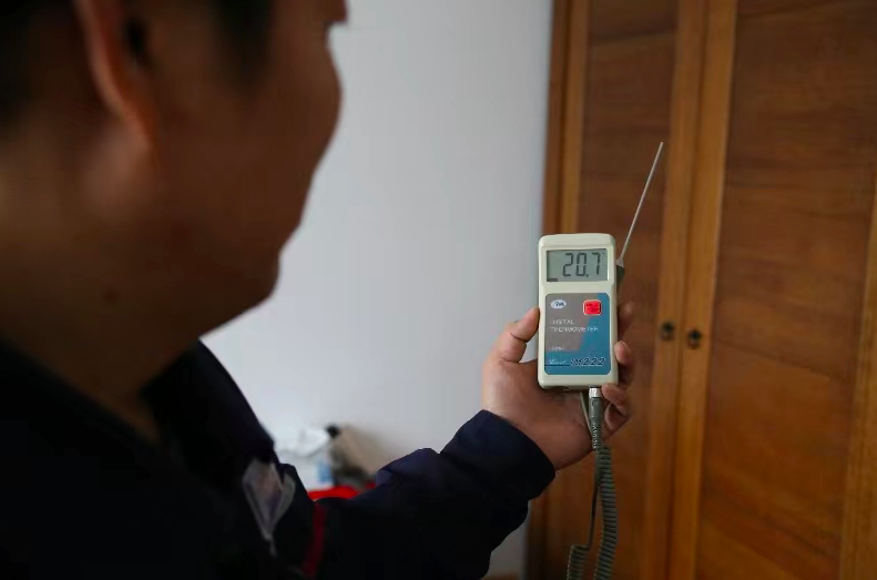 套上鞋套,进入客厅后,孙朝军从工具包中拿出测温仪,左手平托测温仪,右手拿着测温仪手柄在空中静置一会儿,测温仪显示屏上显示出了数字,又过了3分钟,等显示屏上的数字不再变化,孙朝军报出读数:“您看,现在客厅是20℃,室温达标了,我们再给您测测卧室。”不一会儿,卧室温度也测量完毕,21℃,也已达标。