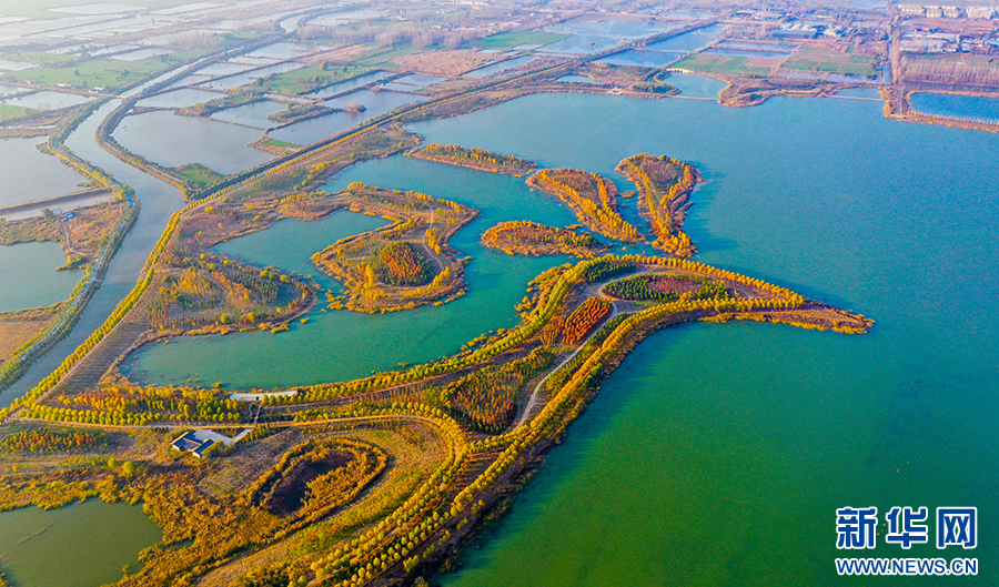 航拍风光旖旎的凤栖湖湿地公园。新华网发 (王圆圆 摄)