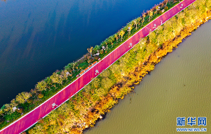 航拍风光旖旎的凤栖湖湿地公园。新华网发(黄洋洋 摄)