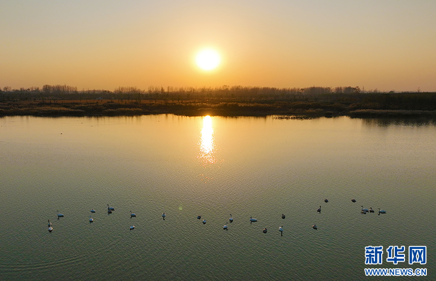 夕阳下的凤栖湖湿地公园。新华网发 (王士龙 摄)