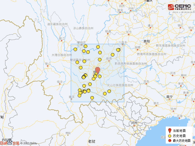历史地震:根据中国地震台网速报目录,震中周边200公里内近5年来发生3级以上地震共42次,最大地震是2021年6月10日在云南楚雄州双柏县发生的5.1级地震(距离本次震中111公里),历史地震分布如图。