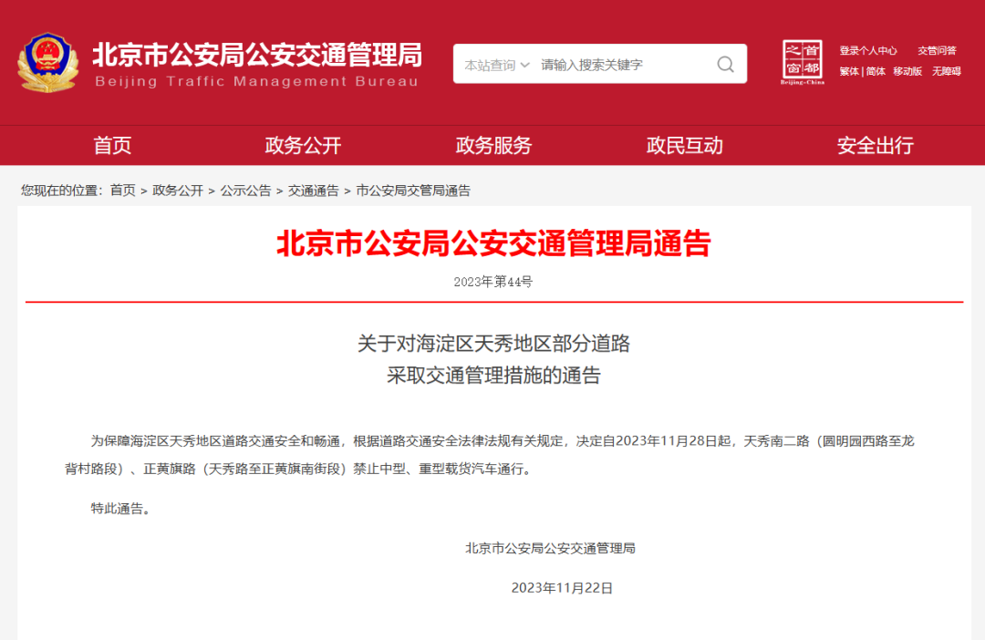 为保障海淀区天秀地区道路交通安全和畅通,根据道路交通安全法律法规有关规定,决定自2023年11月28日起,天秀南二路(圆明园西路至龙背村路段)、正黄旗路(天秀路至正黄旗南街段)禁止中型、重型载货汽车通行。