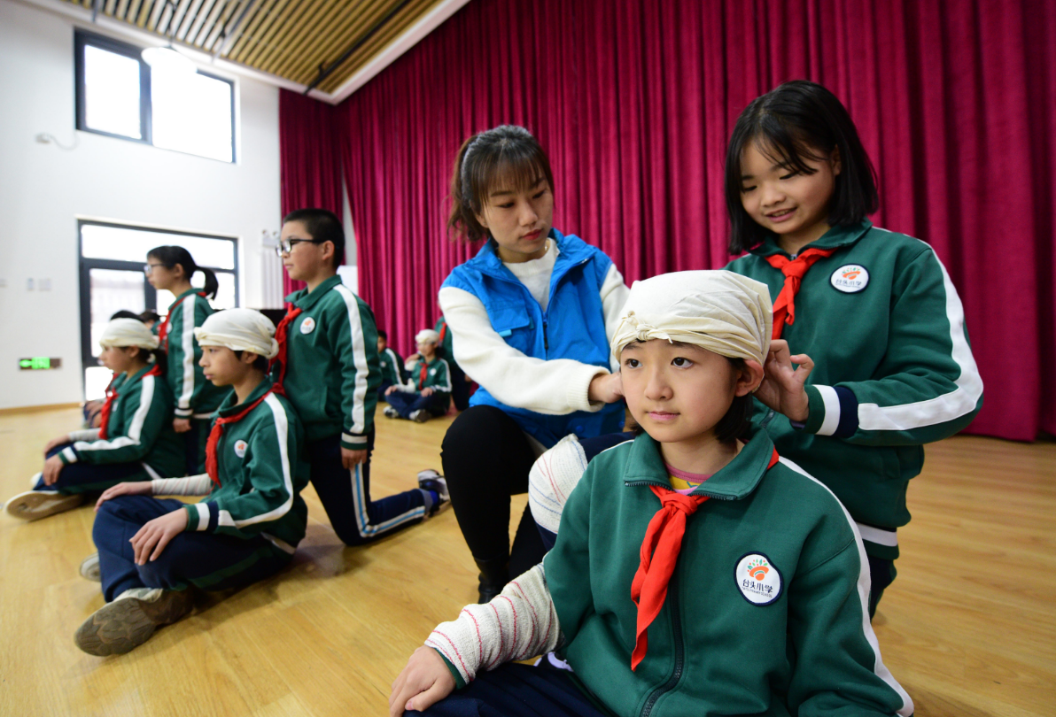 “绷带卷手中拿,卷在上边在下。环形两圈在起点,加压止血靠敷料。环形两圈到终点,固定以后查循环……”在海淀区教科院台头未来实验小学的急救课堂上,该校红十字社团的“小红豆”志愿者两两一组,一边念顺口溜,一边做示范。台下学生饶有兴趣地模仿。
