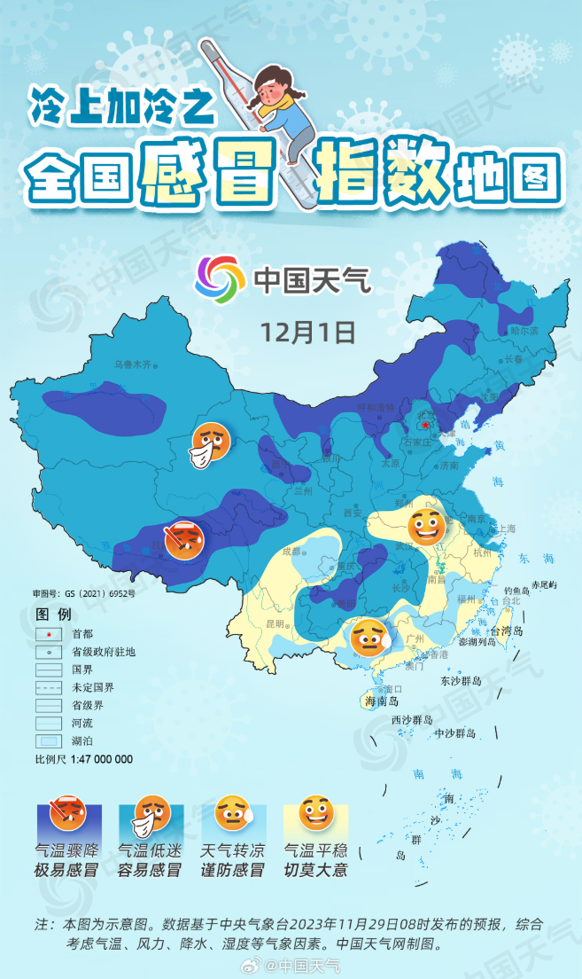 11月30日,冷空气快速南下,南方将成为降温的重心,贵州东部、湖南、江西西部、湖北东部、安徽中南部、江苏南部、浙江中北部等地降温幅度普遍在10℃以上,局地接近15℃,犹如“一日穿越两季”,这一带地区将与天寒风大的内蒙古、西藏等地一同成为极易感冒区域;与此同时,北方大部地区气温仍低迷,这一天全国绝大多数地区的感冒气象指数将较高,大家需重点防护。
