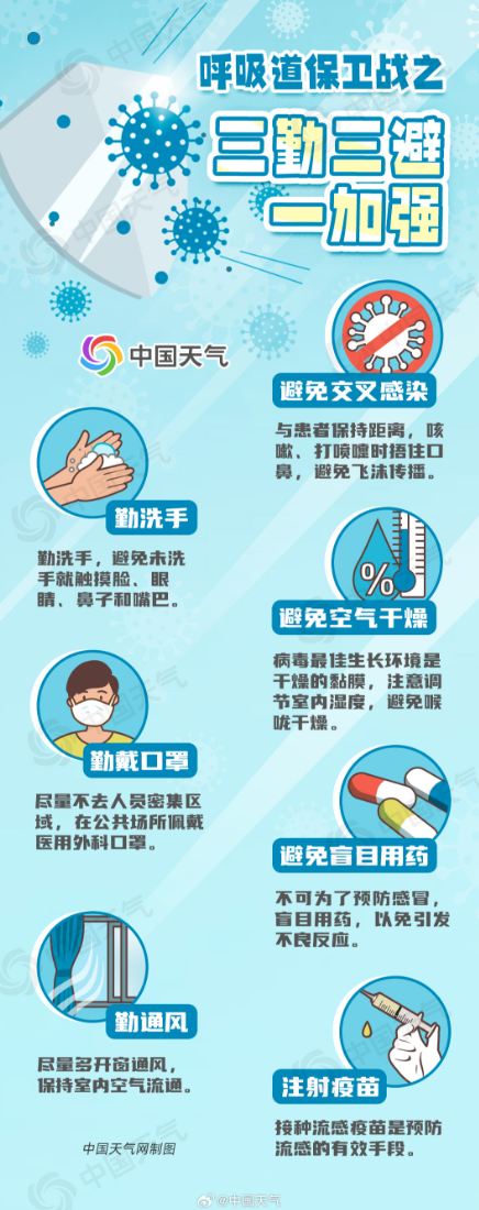 国家流感中心发布的监测显示,截至11月19日,南北方多地流感病毒检测阳性率持续上升,高于2020至2022年同期水平。目前,我国各地呼吸道疾病高发,病毒类型复杂,加上秋冬季节冷空气活动频繁,在气温陡降时,更容易感冒。那么,大家在日常生活中该如何预防呢?牢记“三勤三避”原则,科学预防感冒。