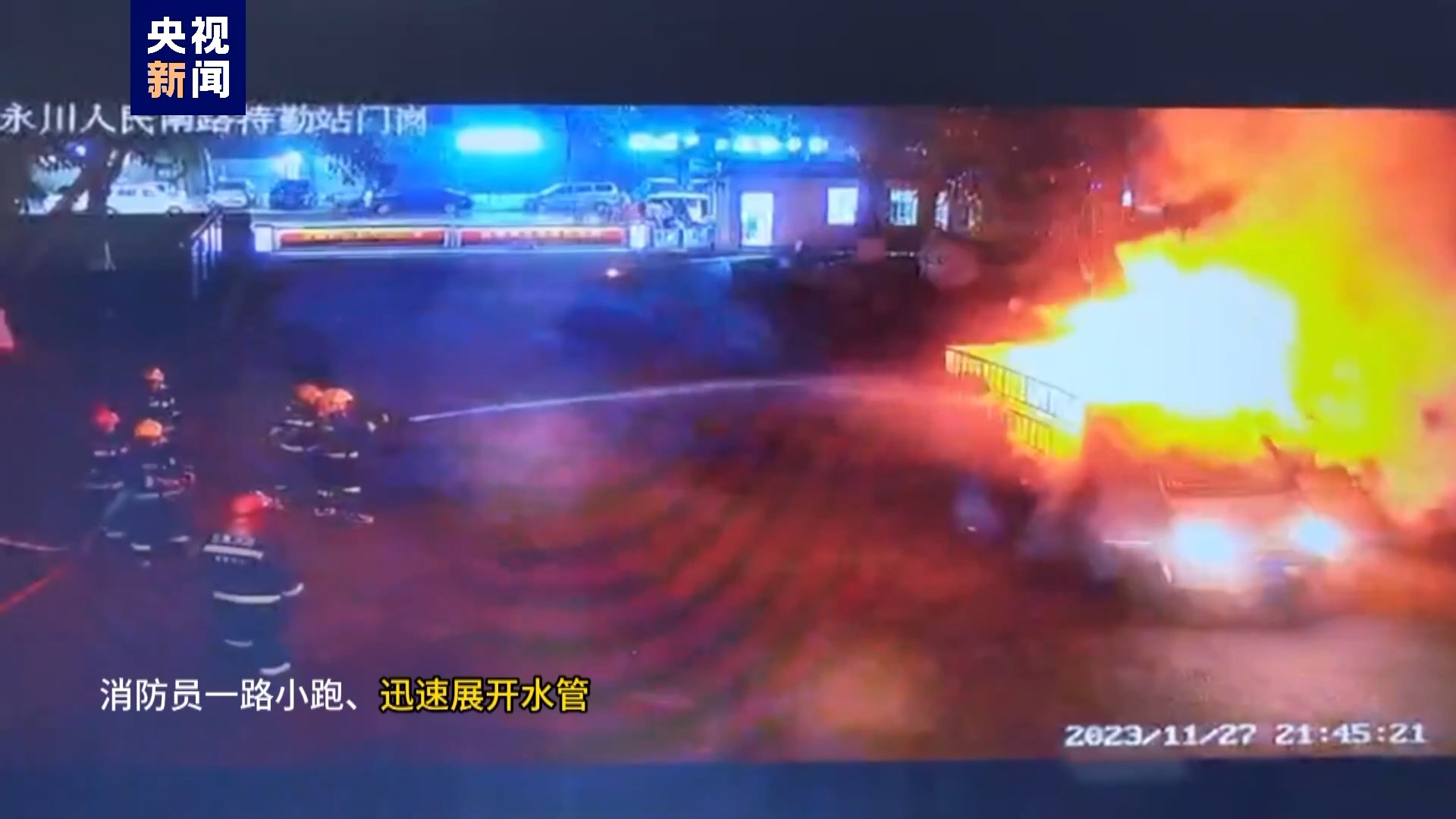 现场视频可以看到,起火的小货车开到永川区人民南路消防特勤站门口后,消防救援站门岗人员立即开门放行并给司机指路,引导货车司机到安全区域,同时拉响电铃通知消防救援人员迅速出动。