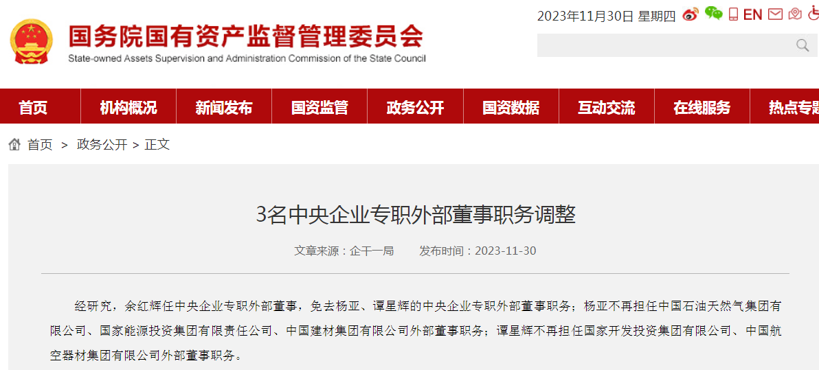 杨亚不再担任中国石油天然气集团有限公司、国家能源投资集团有限责任公司、中国建材集团有限公司外部董事职务;