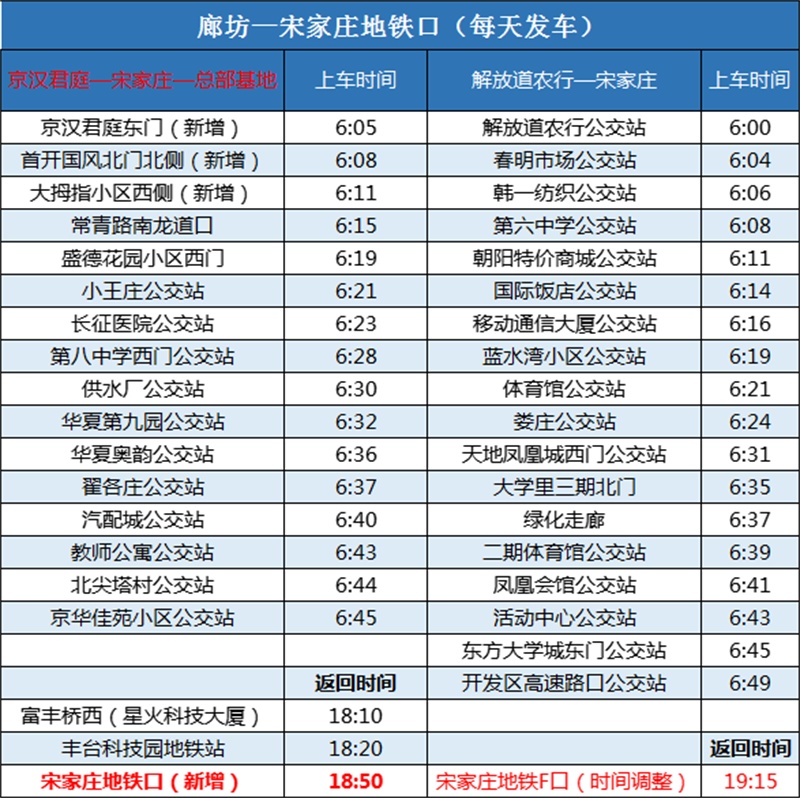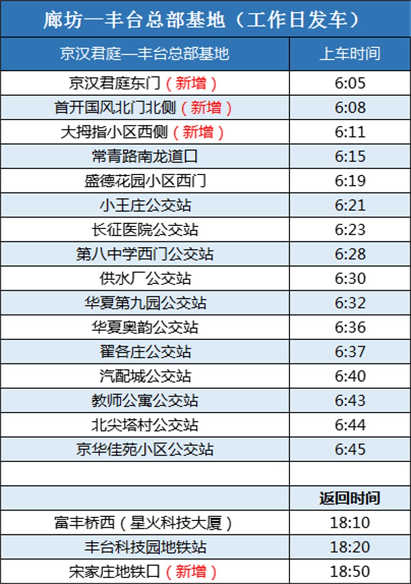 调整后运行线路:京汉君庭小区(6:05)始发经大拇指小区、永兴路、西昌路、北凤道、银河路至丰台总部基地,总部基地停靠点不变(18:10)返回,增加宋家庄(18:50)返回站点。