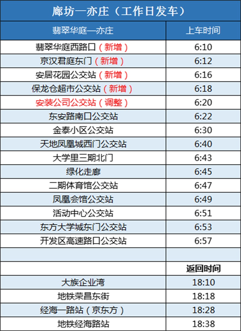调整后运行线路:恒大翡翠华庭(6:10)始发经新开路、东安路、大学城至亦庄,亦庄开发区停靠站点不变(18:10)返回。
