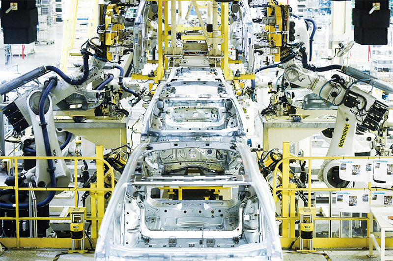 实体经济是金融的根基,金融是实体经济的血脉。近年来,浙江余姚市通过加大科技金融支持、推进创新平台建设等政策,不断壮大优势产业集群,推进制造业向高端化、智能化、绿色化发展。图为2023年4月11日,在一家汽车企业的余姚工厂焊装车间,智能机器人正在作业。 新华社记者 翁忻旸/摄