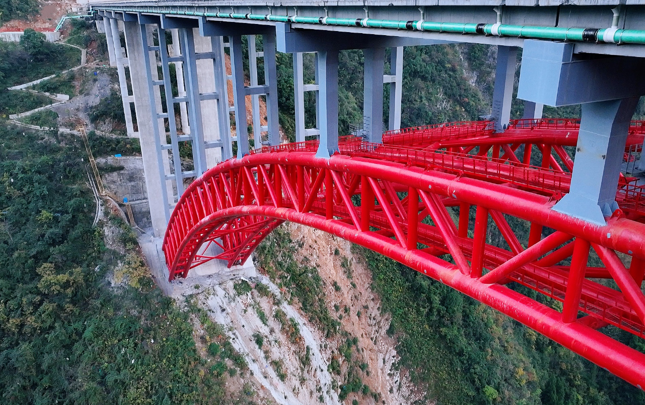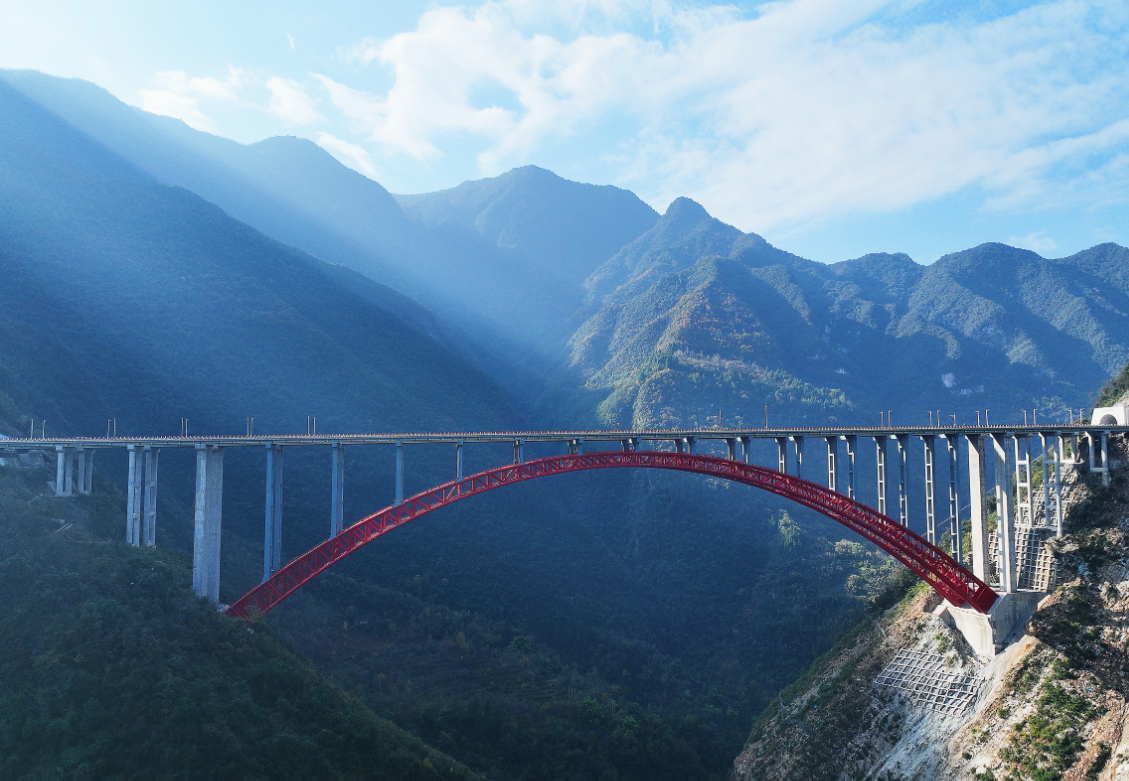 12月4日,我国西南地区最高拱桥——巫镇高速公路东溪河特大桥顺利通车,在大巴山深处架起了一座连通渝陕的钢铁虹桥,红色拱梁犹如群山万壑中的一抹彩虹,为西南地区实现通江达海再筑通途。
